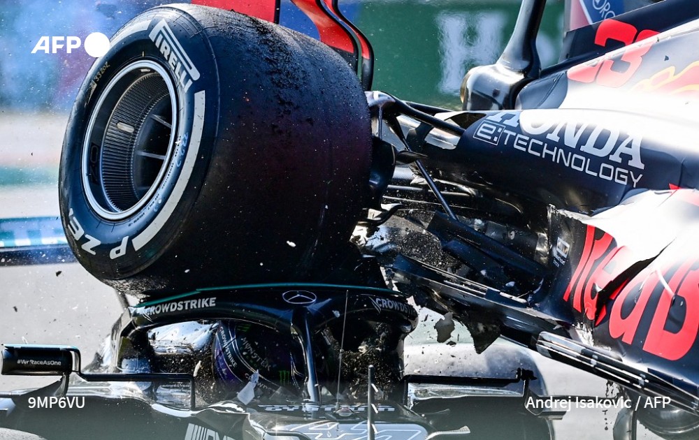 Le photographe basé à Belgrade, Andrej Isakovic, remporte un prix d’excellence dans la catégorie « Sports Action » pour son cliché impressionnant de la collision entre la Mercedes du pilote britannique Lewis Hamilton et la Red Bull du Néerlandais Max Verstappen, lors du Grand Prix de Formule 1 d'Italie sur le circuit de l’Autodrome National de Monza, le 12 septembre 2021.